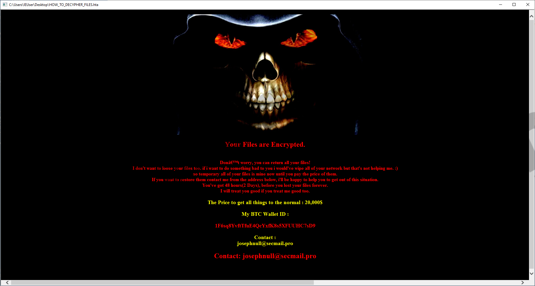 Josephnull RansomwareJosephnull Ransomware is a file-encrypting threat. Thus, an encounter with it could end in you being unable to open any of your files. On top of this, you might see a message on your screen that shows a skull with red glowing eyes. It might claim that the only way to get your files decrypted is to purchase decryption tools. In other words, you could be asked to pay ransom to get your data back. Researchers say that paying the ransom is risky because you cannot be sure that you will get what you pay for. Thus, if you do not want to take any chances, you may want to look for other ways to get your files back, like getting your backup copies. If you want to learn more about it before deciding what to do, we invite you to read our full article. At the end of it, you can find deletion instructions that show how you could erase Josephnull Ransomware manually. We wish to start with an explanation of how this malicious application could end up on your computer. Unfortunately, victims of threats like Josephnull Ransomware are often tricked into launching them. For example, they may receive emails saying that they need to open the attached links or files, and once they do, the system gets infected. Moreover, sometimes malicious launchers are uploaded onto harmful file-sharing websites. Thus, some users might download and launch such threats while believing that they are launching an installer of a program, game, or update. If you do not want this to happen to you, we recommend not to open any email attachments or links in messages if you were not expecting to receive them, if such content comes from unknown senders, or if something raises your suspicion. Also, we advise not to download files from unreliable file-sharing websites. If you are ever in doubt about a file, do not forget that you can always employ a reliable antimalware tool and perform a quick scan to check the file out. If Josephnull Ransomware’s installer gets launched, the malware might create a copy of itself in the %TEMP% directory as well as some Registry entries. Once it is settled in, the threat ought to start the encryption process. The malicious application might encipher all documents, photos, archives, videos, and files alike during it. The data that should be left unaffected ought to be the one belonging to the operating system or other software that could be installed on the victim’s device. Users can recognize encrypted files without even trying to open them as all encrypted files ought to get an additional extension titled .crypted, for example, panda_habitat.pdf.crypted. After Josephnull Ransomware encrypts targeted files, victims ought to notice that the malware has replaced their wallpapers. It is also impossible to miss a message on top of your screen when it shows a scary skull picture and contains a text written mostly in red letters. Josephnull Ransomware’s ransom note explains that users who agree to pay ransom can get their files back, and users who refuse will lose their data forever. This is not exactly the case if you have backup copies. If such a case, you could replace all or at least part of your files that got encrypted with their copies. We highly recommend using this opportunity if you have it because you cannot be sure that hackers will hold on to their end of the deal. In other words, they may promise to deliver decryption tools after you pay, but it is possible that you might never get them. If you refuse to pay, we advise erasing Josephnull Ransomware with no hesitation. Our researchers say that there are a couple of ways to get rid of the malware. If you feel experienced enough, you could try to delete Josephnull Ransomware manually. The instructions available below this paragraph can guide you through this process, although we cannot guarantee that they will work for everyone. The other solution might be much easier as it does not require you to do everything on your own. To be more precise, the other option is to employ a reliable antimalware tool and let it perform a full system scan. Afterward, you ought to be allowed to remove Josephnull Ransomware and other identified items by pressing the displayed deletion button. Restart the computer in Safe ModeWindows 8/Windows 10