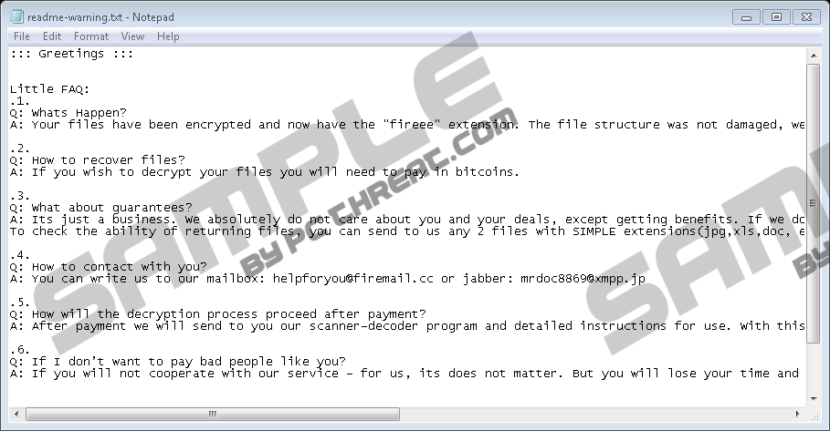 Fireee RansomwareFireee Ransomware is the threat that corrupted files and pinned the “.[*].[helpforyou@firemail.cc].fireee” extension to their names. The files that this malware corrupts are classified as personal, which means that they are most likely to be documents, archives, projects, photos, etc. Why do the attackers behind this malware only care about personal files? That is because they know that they cannot be replaced. Of course, that is not the case every time. Some people have backup copies of all important files, and if these copies are stored somewhere safe, it does not matter too much about what happens to the original files. Once the victim removes Fireee Ransomware, they can then replace the corrupted files with backups. Hopefully, that is your situation, because if you do not have backups, we cannot help you much. Of course, we can help you delete the malicious infection, and we suggest taking care of that sooner rather than later. We can make guesses about how Fireee Ransomware slithered into your operating system. Most likely, you executed this malware by opening a file sent to you via email. Did we hit the bullseye? Perhaps this malware hid within a software bundle, and you executed it by accident when installing other programs? Whatever the case might be, if your system was protected appropriately, Fireee Ransomware would not have been able to root down within your system. It would have been removed automatically. Well, can’t you just delete this threat when it slithers in? Perhaps some victims would be vigilant enough to catch and eliminate this malware before it corrupted any files, but, according to our researchers, it is very quiet, and it can encrypt files without notice. Only after all files are encrypted does this malware introduce itself, and it does that with the help of a file named “readme-warning.txt.” Copies of this file should be dropped in every affected folder. While it is not dangerous to open it, you have to be careful. After all, the message inside was set up by cybercriminals. The message file dropped by Fireee Ransomware uses the question-answer format. There are six questions and answers, and they pretty much cover what the attackers want you to know. First, they explain that files were encrypted. Next, they inform that files can be recovered only after a ransom is paid in Bitcoin. The third answer suggests that all files would be decrypted because the attackers “do not care about you and your deals, except getting benefits.” Needless to say, this does not make sense, and that is exactly why we do not believe that the attackers would give you anything in return for your money. Next, you are introduced to an email address (helpforyou@firemail.cc) and a contact at Jabber (mrdoc8869@xmpp.jp), and you are supposed to use these contacts to communicate with the attackers. It is stated that once you contact the attackers, you will be able to pay for the “scanner-decoder program” that, allegedly, will restore the files. So, are you interested in contacting the attackers and paying for a decryptor? If you want our advice, we suggest NOT exposing yourself to them and also keeping your money to yourself. Hopefully, it is easy for you to decide not to follow the demands of the creator of Fireee Ransomware because you have backup copies of all encrypted files. At least, the most important ones. If that is the case, you should mainly focus on the removal of the infection. Unfortunately, getting rid of this malware manually will be impossible for most victims. That is because the launcher uses a random name, and it could be dropped anywhere within your computer. Obviously, if you know where this file is, and you can identify it as malware, deleting Fireee Ransomware yourself should be easy. However, can you also secure your system? When it comes to malware, the lighting can definitely strike twice, and it is your responsibility to secure your system and keep malware away. This is why we believe that it is best to employ anti-malware software. It will delete all threats automatically and it will also ensure Windows security. Once you take care of that, do not forget to keep up with backups too. If you have backup copies of your files, ransomware will not intimidate you. Fireee Ransomware Removal
